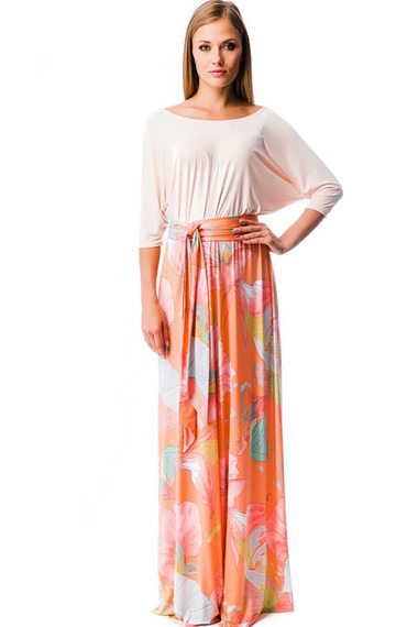 Длинное платье из микрофибры двух цветов: свободный верх кремового цвета. и яркая юбочная часть оранжевого цвета с крупным рисунком. Платье дополняется длинным поясом.
