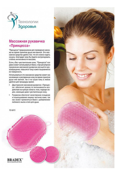 - Рукавичка «ПРИНЦЕССА» удобно надевается на руку, что позволяет обеспечить регулировку интенсивности массажа исходя из Ваших индивидуальных особенностей. Подходит даже для самой чувствительной кожи.